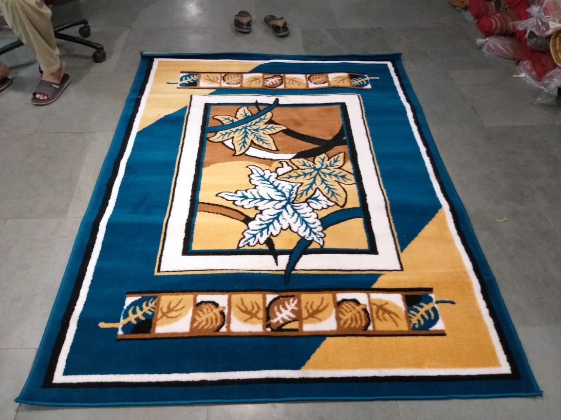 A stylish premium carpet featuring elegant leaf motifs and bold color contrast in teal blue and mustard tones — perfect for bright, vibrant, and modern home interiors.