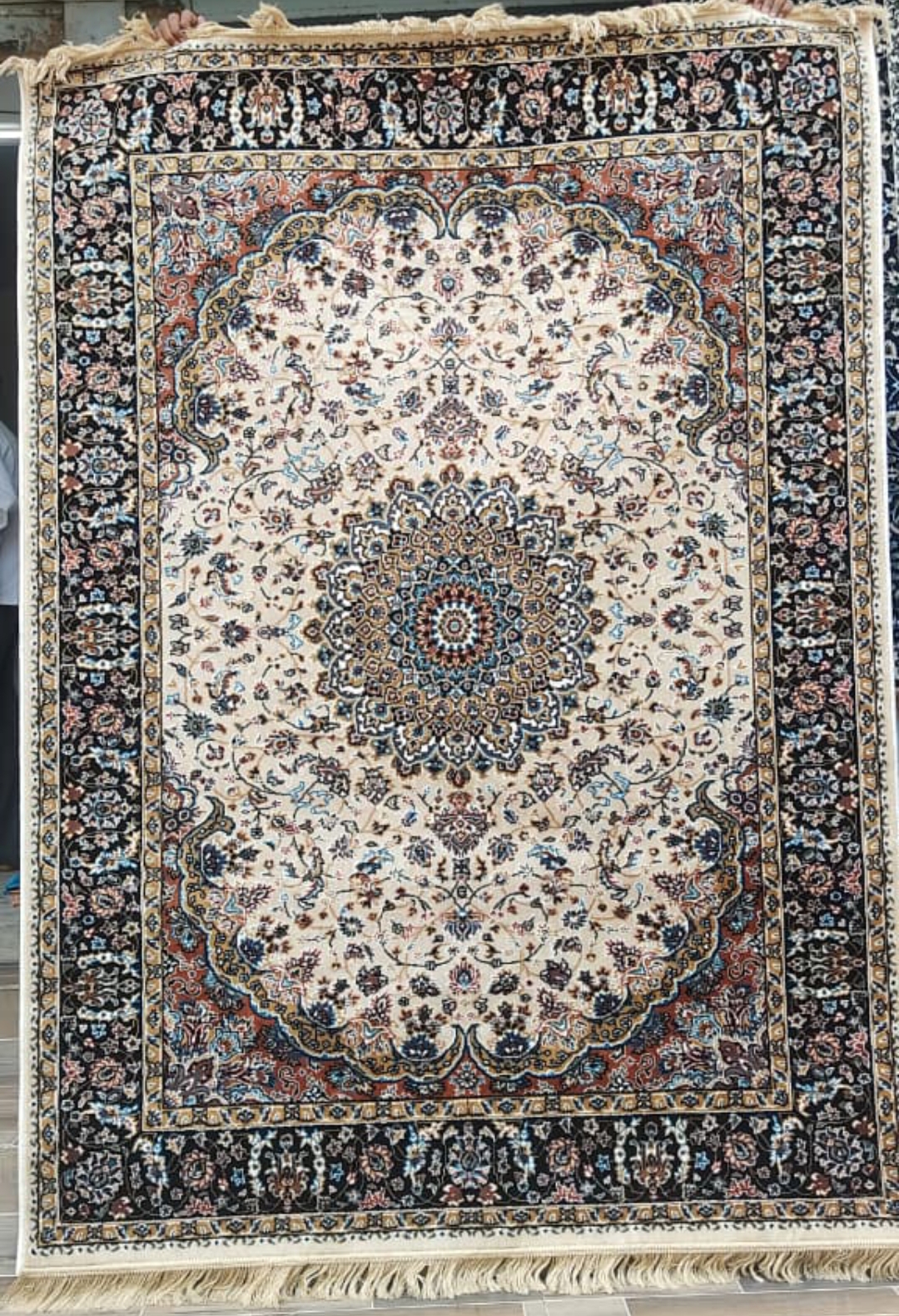 The Classic Ivory Persian Carpet (MM54) is a masterpiece of timeless elegance and Persian artistry. Set on a refined ivory base, this rug showcases a detailed medallion pattern surrounded by ornate floral motifs in hues of navy blue, rust, and soft beige. Its intricate border work enhances its royal appeal, creating a balance of color and design that complements both traditional and modern spaces. Made using advanced machine weaving, the carpet offers superior softness, durability, and long-lasting vibrancy. Crafted from blended PP and mixed fibers, it provides the perfect mix of strength, comfort, and style for export buyers seeking premium quality.