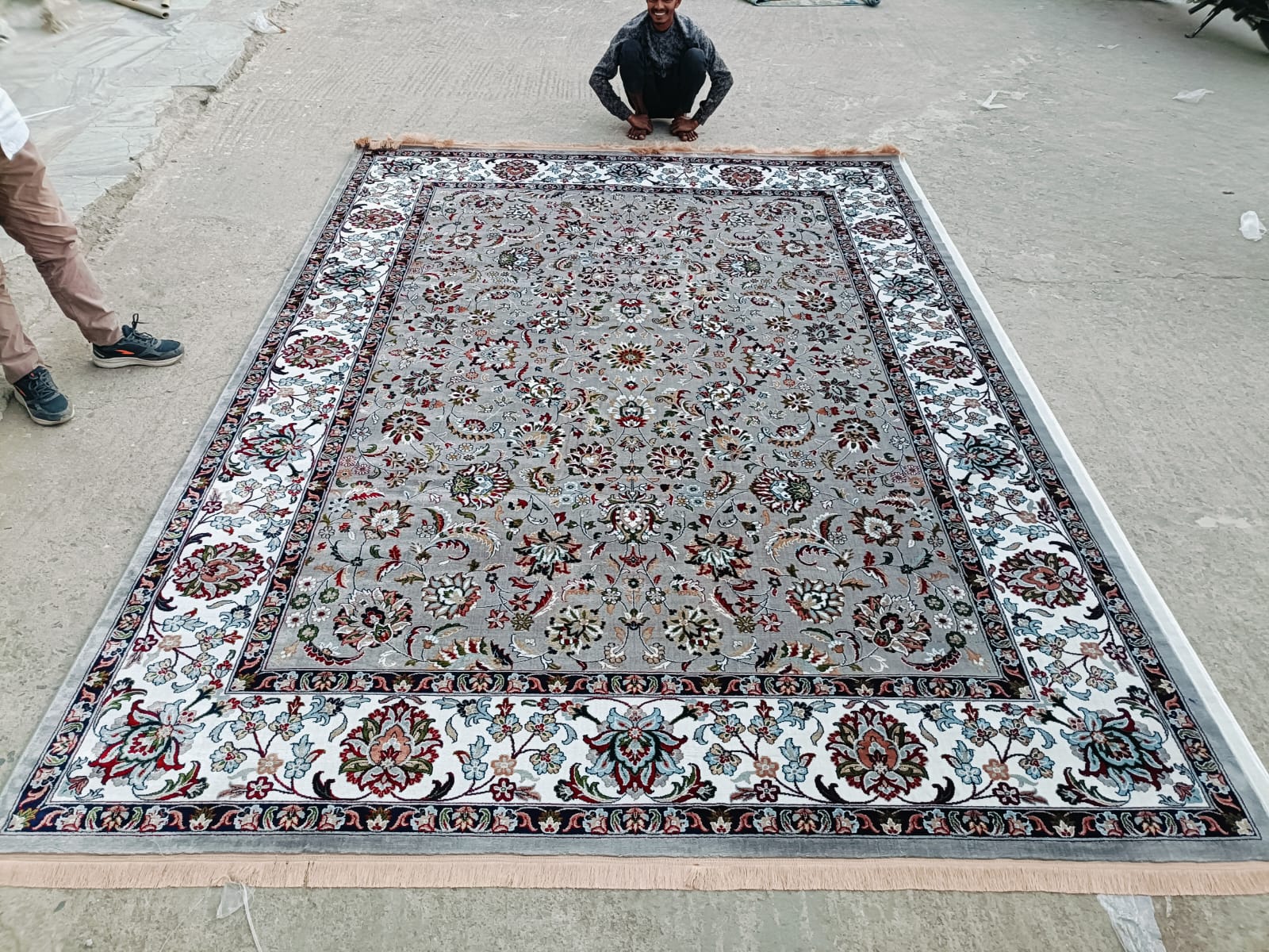 A graceful Persian-style carpet featuring a soothing grey base with floral detailing and ivory borders — perfect for creating a refined, export-quality home décor statement.
