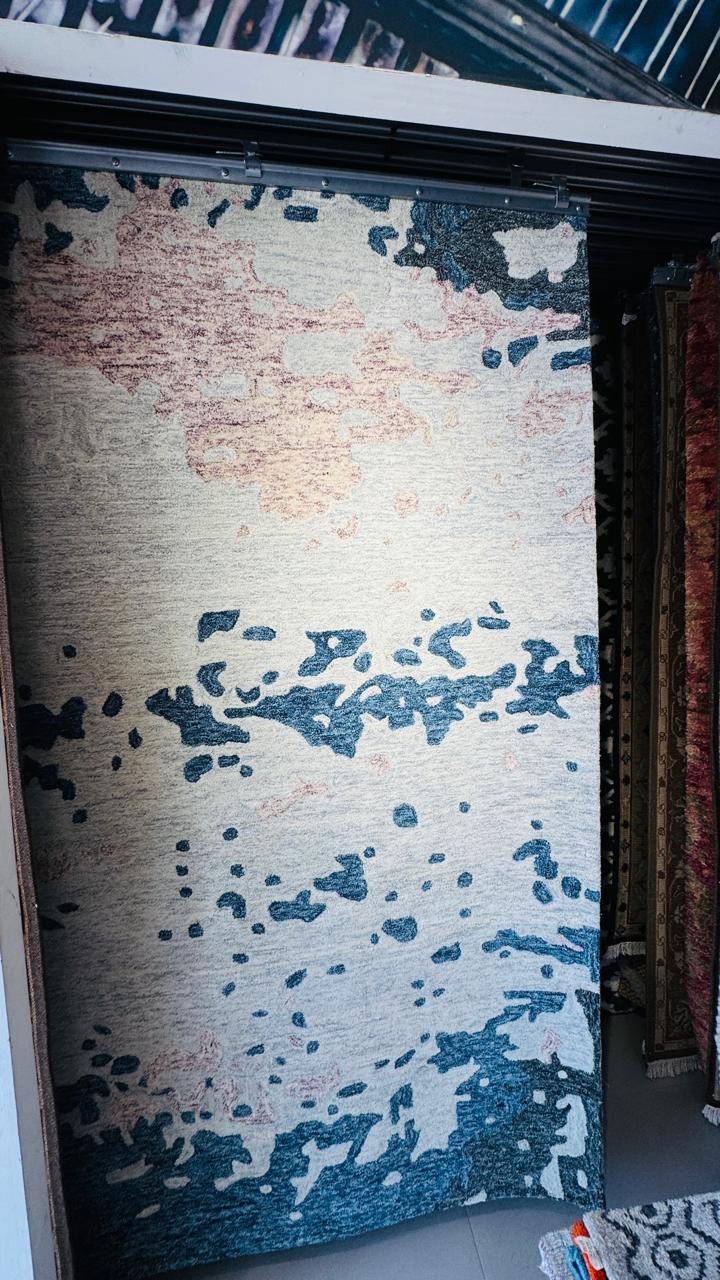 The HN05 Handloom-Tufted Carpet celebrates modern artistry in handcrafted form. Its design takes inspiration from ocean waves and natural textures, blending shades of calm blue, beige, and muted blush in a fluid, painterly pattern.