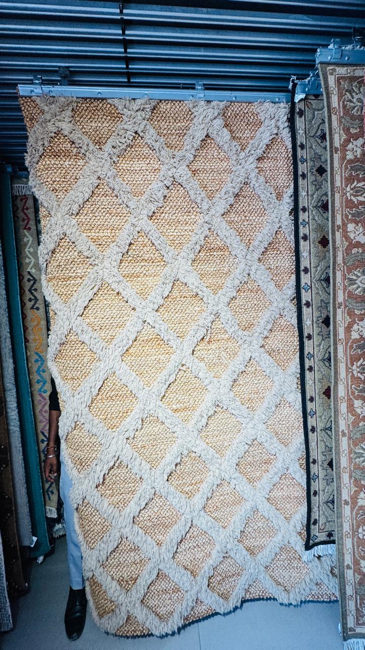The HN09 Handloom Wool Textured Carpet combines luxury, depth, and handcrafted beauty in one stunning piece. Expertly handwoven using high-quality wool, this rug showcases a raised shaggy diamond lattice pattern over a dense looped base. The contrast between the soft ivory shag and warm beige loops creates a rich 3D texture that instantly elevates any living space.