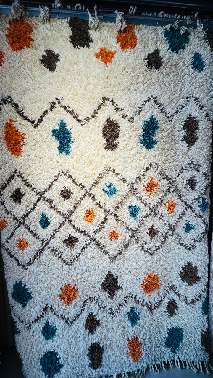 Its ivory base is beautifully accented with bold teal, rustic orange, and deep brown motifs, inspired by Moroccan tribal patterns. The playful shapes and diamond geometry add visual interest while keeping the overall look modern and relaxed.