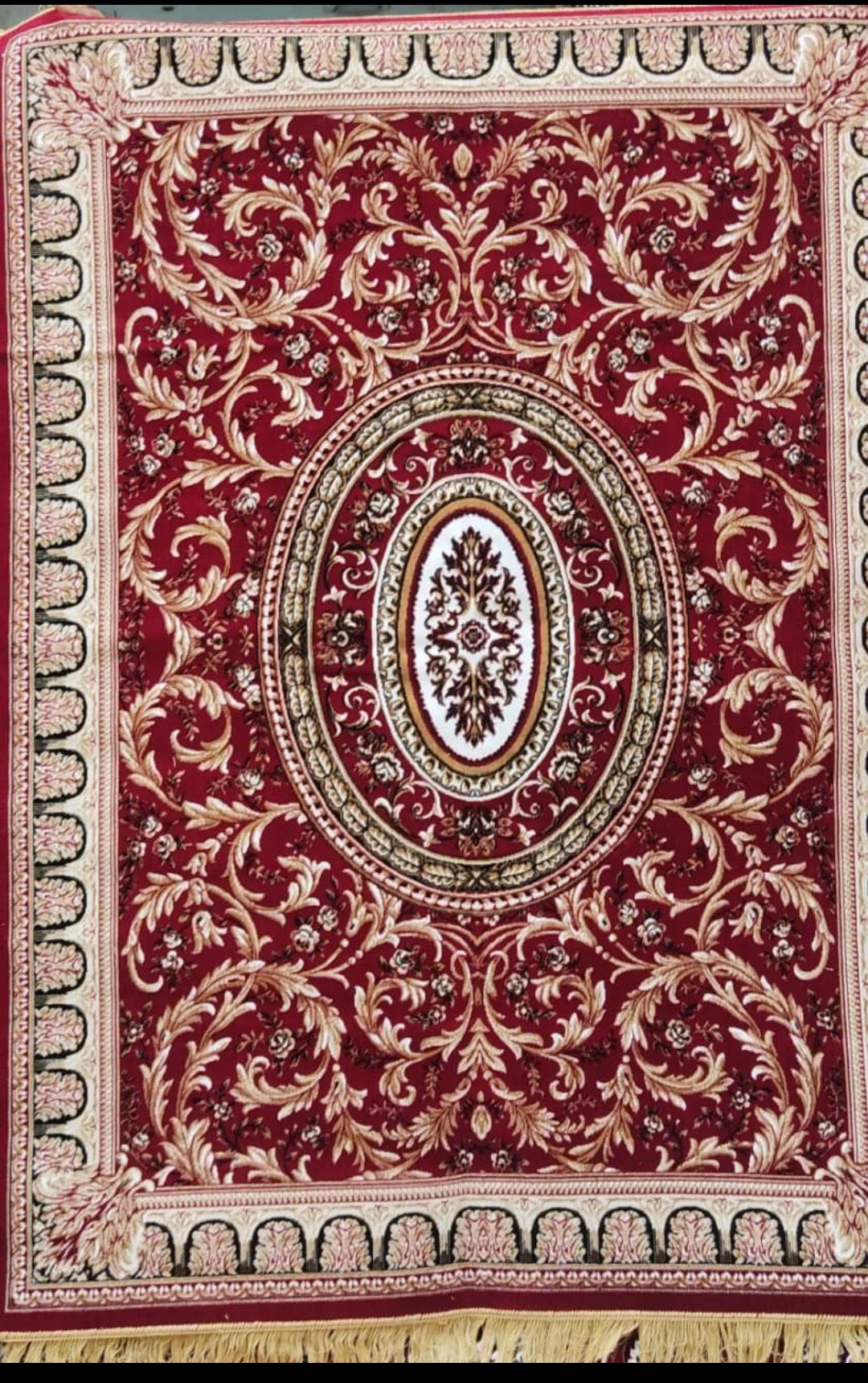 The Majestic Oval Medallion Carpet (MM45) radiates regal elegance with its striking red base, intricate golden vine motifs, and a beautifully framed oval medallion at the center. The combination of deep maroon tones and soft beige detailing adds a royal touch, while the decorative borders enhance its grandeur. Machine-woven from a blend of PP and mixed fibers, this carpet ensures durability, smooth texture, and long-lasting color brilliance. Perfect for export buyers, this masterpiece combines luxury design with easy maintenance and versatile placement.